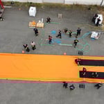 Für uns war das eine Spende in besonderer Höhe, weshalb wir auch die Übergabe in ungewöhnlicher Höhe per Drehleiter mehr Ausdruck verleihen wollten. Die Kids hatten auch eine Collage als kleine Anerkennung vorbereitet, die sie im Austausch mit dem Scheck überreichten.