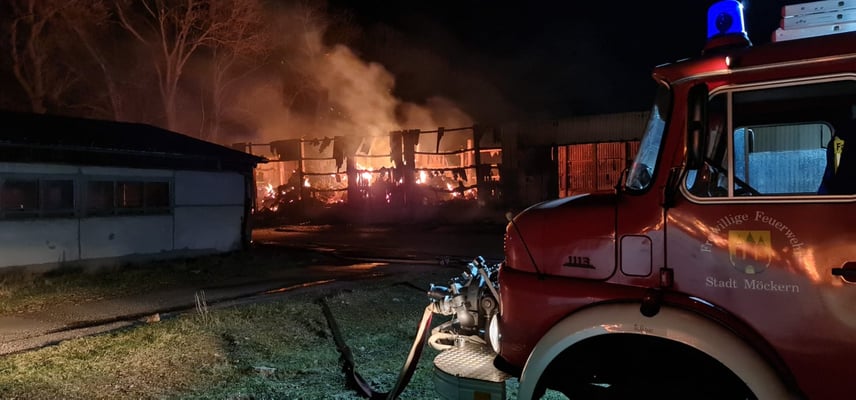 Beim Eintreffen an der Einsatzstelle waren bereits weitere Feuerwehren vor Ort, es brannten 3 große Lagerhallen voll mit Stroh und Heu. Es waren insgesamt 6 Feuerwehren aus dem Stadtgebiet Möckern und 2 Feuerwehren aus dem Stadtgebiet Gommern alarmiert.