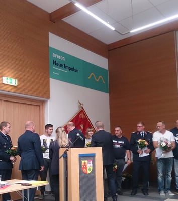 Am Wochenende darauf fand dann die offizielle Festveranstaltung mit über 130 geladenen Gästen in unserer Stadthalle statt. Angefangen bei unserem Landrat, über Gäste aus anderen Feuerwehren bis zu unserer neuen Bürgermeisterin war alles vertreten. In den Grußworten wurde an Vergangenes erinnert, gute Wünsche für die Zukunft ausgesprochen und sich bei unseren Kameradinnen und Kameraden für die ständige Einsatzbereitschaft bedankt. Als Ortsbürgermeister war es mir eine besondere Ehre, jeder Kameradin und jedem Kameraden eine von mir gestiftete Anstecknadel zur Erinnerung an die 130-Jahr-Feier unserer Feuerwehr zu überreichen. Der Abend klang mit einem Buffet und Getränken langsam aus.
