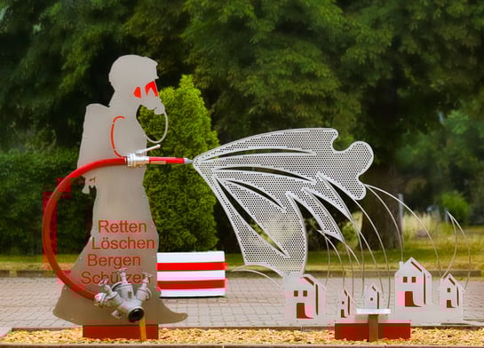 vom Möckeraner Künstler Rolf Otto, gebaut, aufgestellt und gesponsert von der Firma Degener Metall- und Montagebau, ziert es den Platz vor unserer Feuerwehr. Eine gute Idee, die immer an die Arbeit und Einsätze unserer Feuerwehr erinnert.